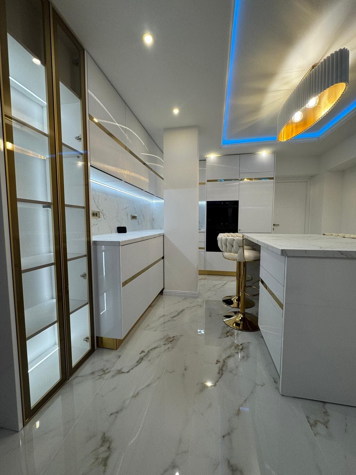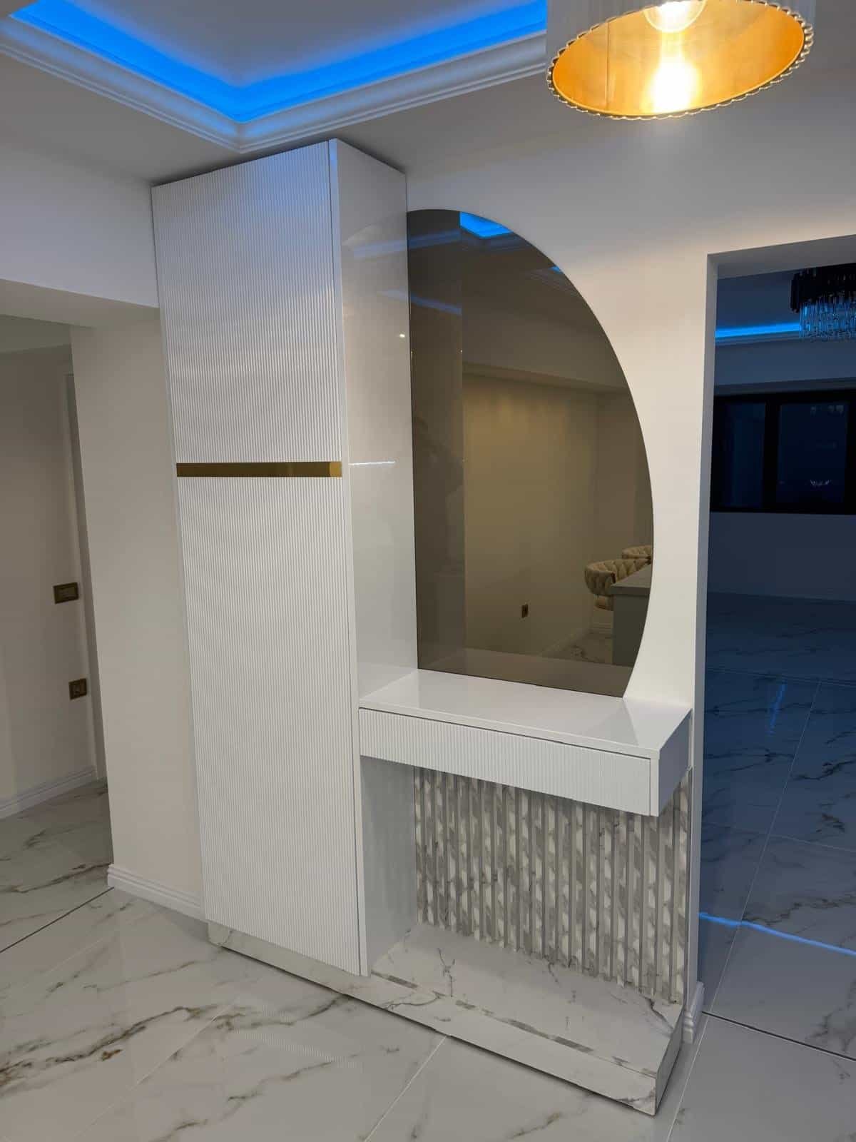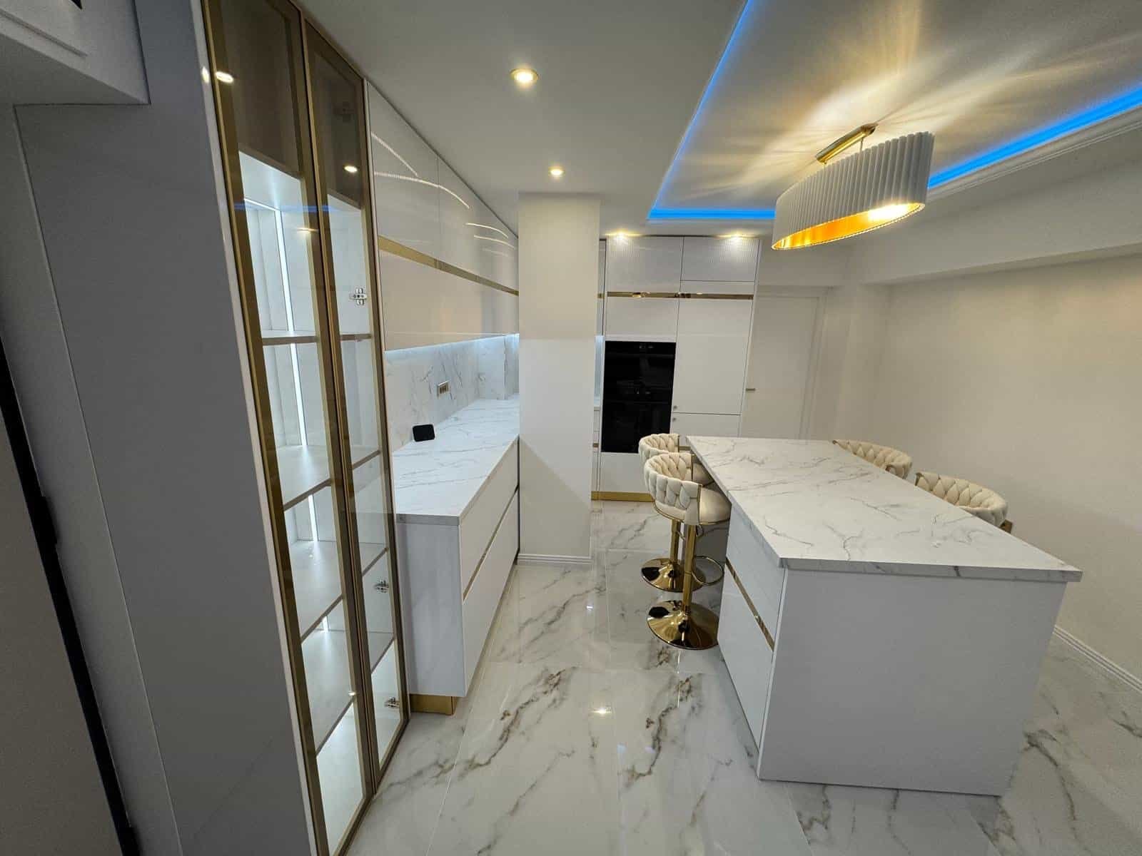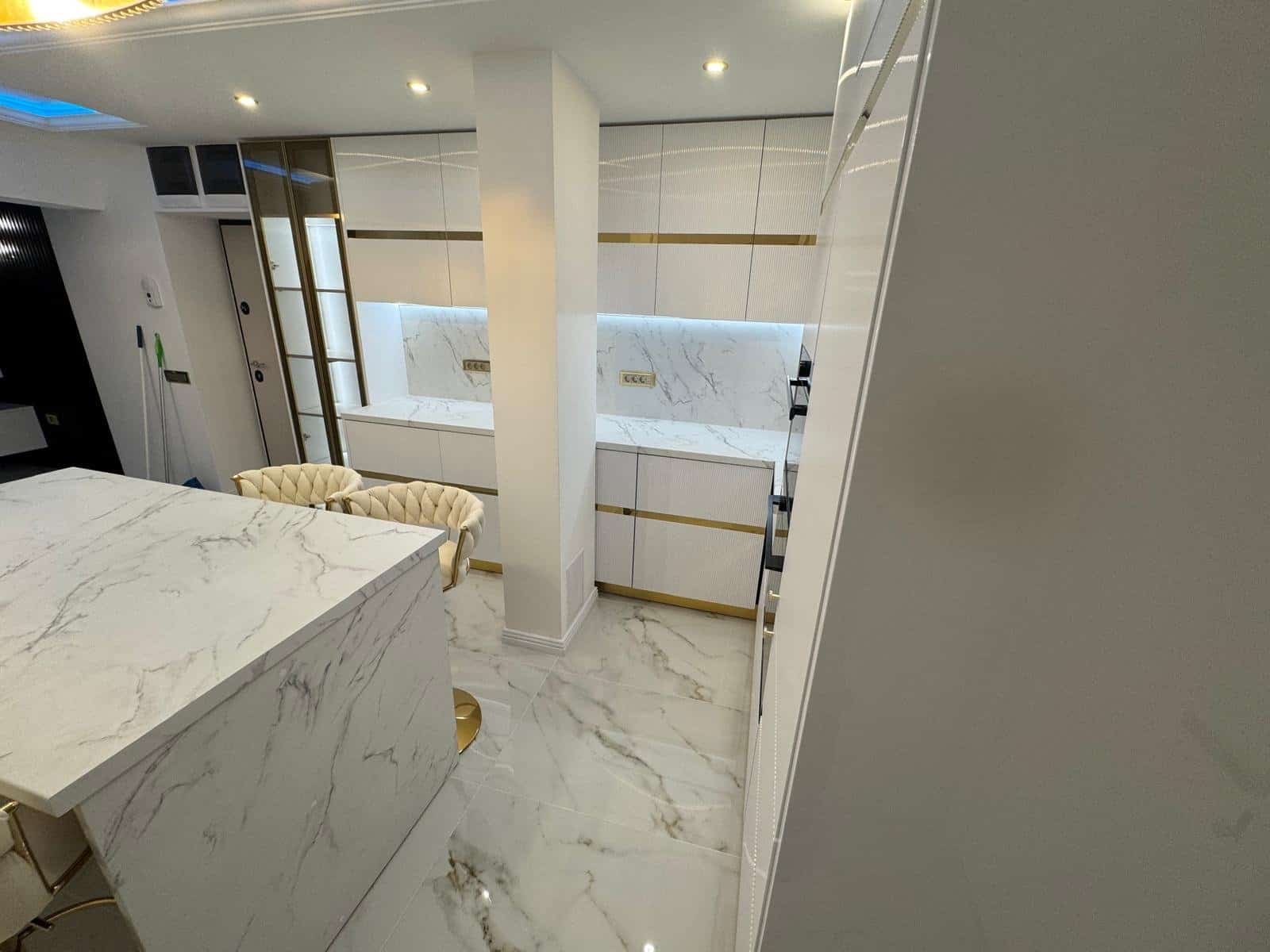 Mobilierul este executat la centimetrul perfect, gandit in cele mai mici detalii pentru impact vizual si functionalitate maxima. Fiecare piesa este personalizata, cu elemente premium si accente de auriu care transforma spatiul intr-un apartament elegant si eficient.